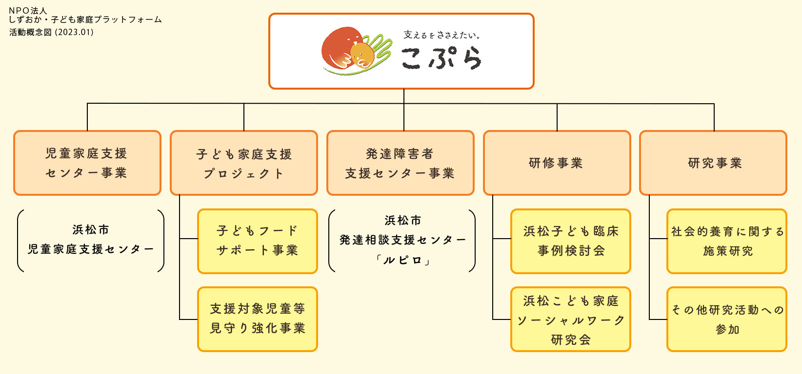 具体的には、浜松市からの受託事業とこぷら独自事業があります。